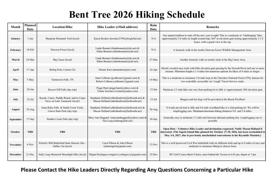 If you would like to be added to the hiking club’s roster and receive notices of upcoming hikes, as well as any changes to the schedule, postponements, rain delays etc. email